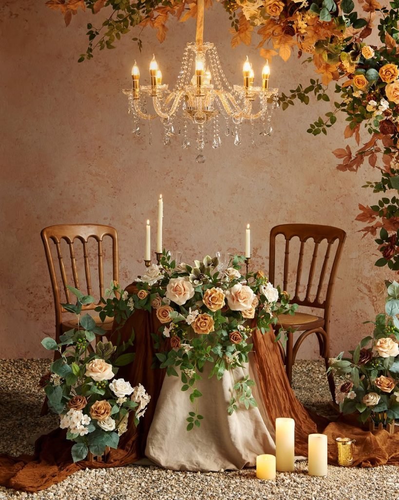 Golden hour romance, captured in silk and candlelight. This intimate sweetheart table feels like a whispered love letter to fall — with cinnamon and taupe roses cascading through eucalyptus, soft ivory blooms, and draped amber linens pooling like warm honey.