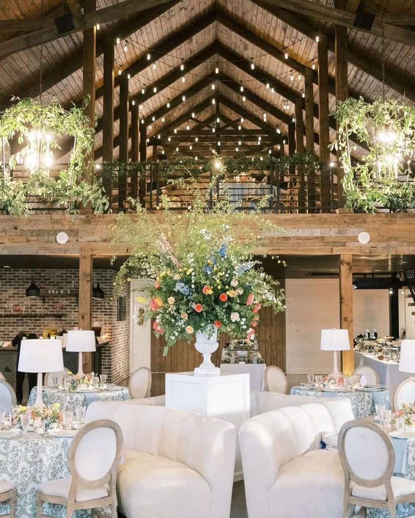 A venue that hums with warmth and elegance — where string lights glitter like stars beneath vaulted timber beams, and garden blooms spill effortlessly from urn to table.