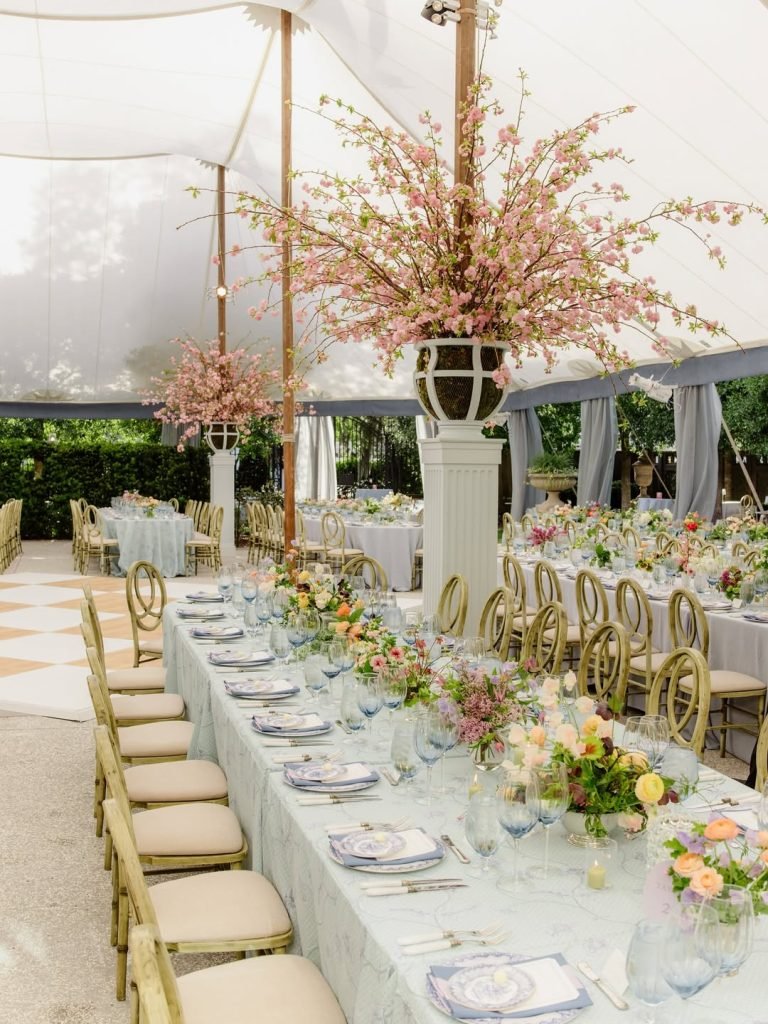 Under a luminous tented sky, the scene unfolds like a spring garden soirée plucked from a dream. Sculptural urns overflowing with cherry blossom branches anchor the space, their blush-pink petals echoing the soft pastels woven through each tablescape.