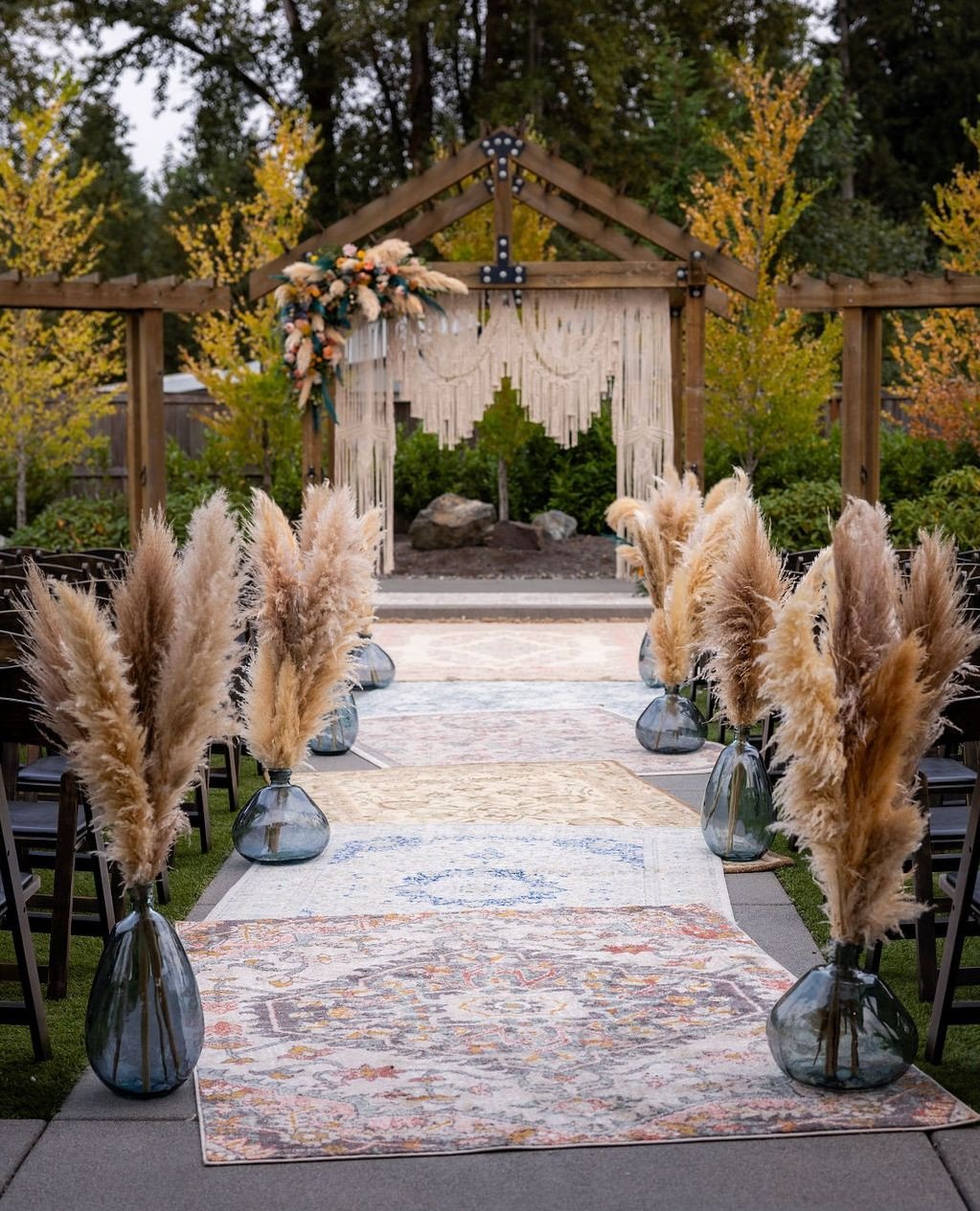 That layered rug aisle? So cozy. The pampas grass in oversized blue vases? Effortlessly cool. And don’t even get me started on the macramé altar—it’s like vintage soul met modern love and ran away together. There’s something about this mix of peachy florals, moody blue glass, and golden fall foliage that just gets me.