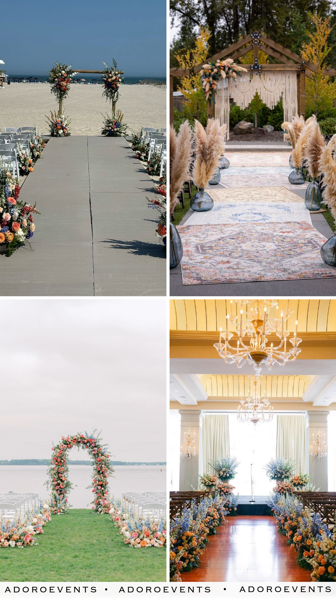 The open water behind, the rows of white chairs, the riot of romantic color hugging the aisle—this is beachside elegance with a touch of whimsy. Honestly, if I ever disappear, check here first.