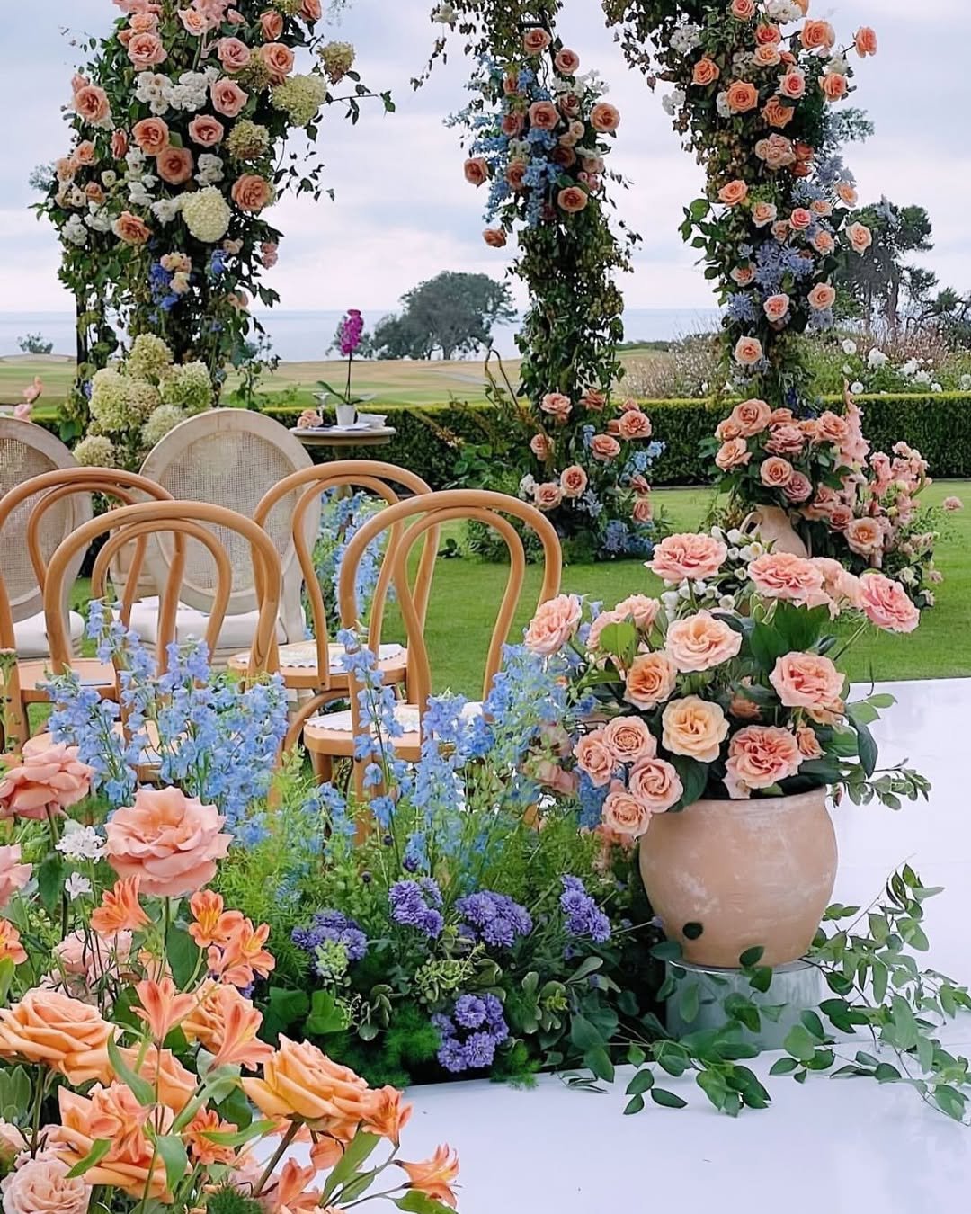 The terra cotta pots, the woven chairs, that soft ocean view in the background… it’s giving whimsical garden party meets European countryside—and I’m fully obsessed. If I were a guest here, I’d never leave my seat (except maybe to sneak a closer look at those dreamy floral pillars).