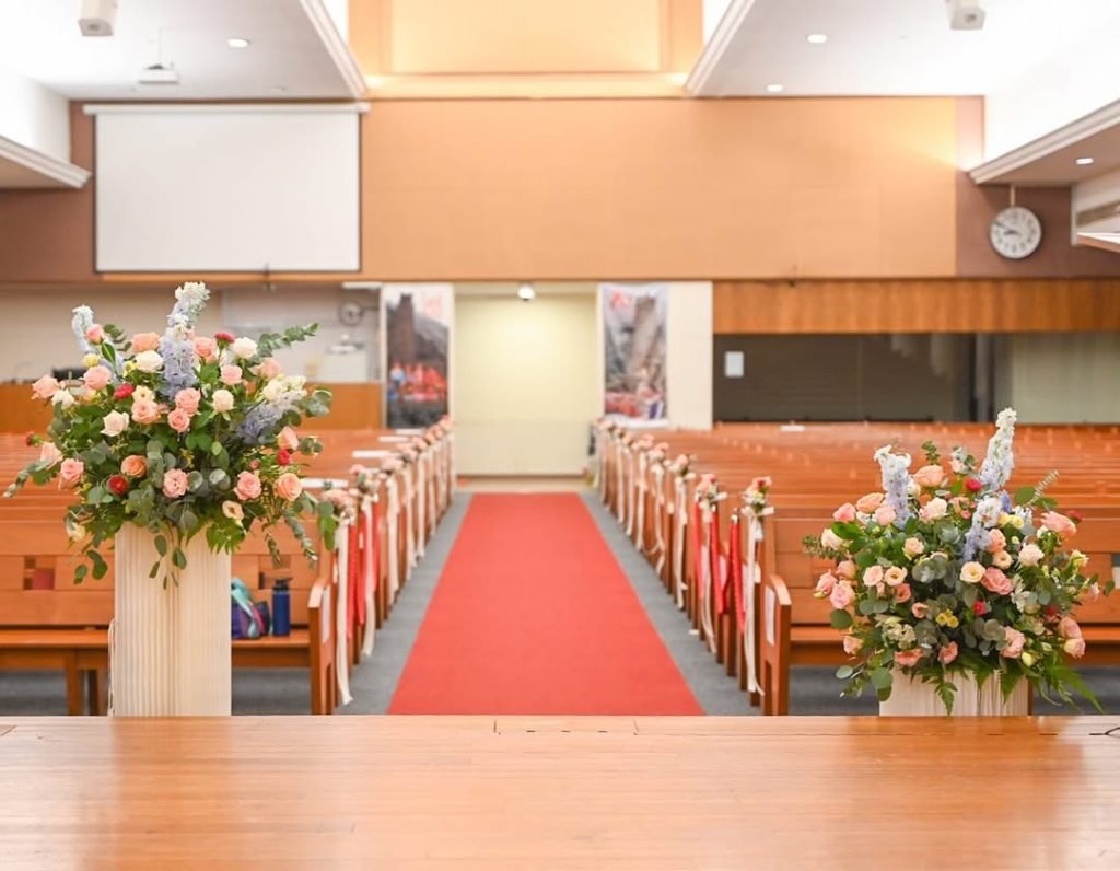 A quiet aisle, a sacred space — softly adorned in peach roses, sky-blue delphiniums, and cascading eucalyptus. This timeless church setting feels touched by grace, each bloom whispering a blessing as vows are spoken.