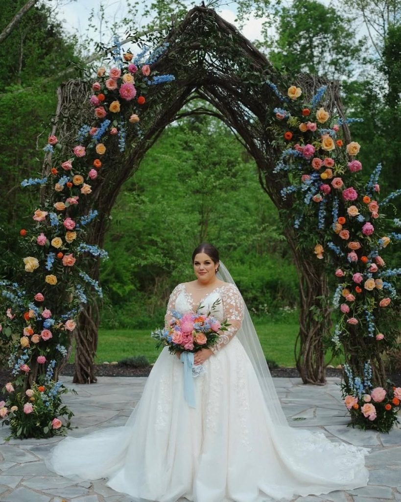 A living arch of twisted vine and bloom, as if conjured by nature herself. Peach ranunculus, candy-pink roses, and sky-blue delphiniums bloom boldly against a wild green backdrop, setting the scene for a bride who looks every bit like a fairytale come true.