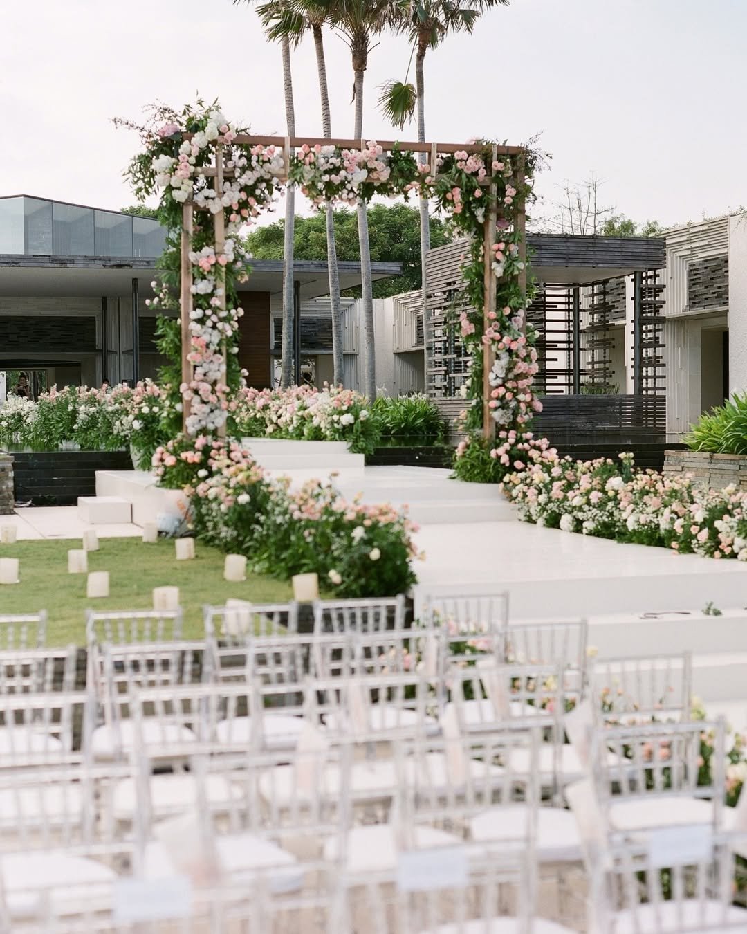 There’s something about a clean-lined venue with tropical palms overhead that just gets me. This ceremony setup by @theweddingatelier.co takes that minimal-modern vibe and softens it with cascading peach and blush florals—and I’m officially in love.