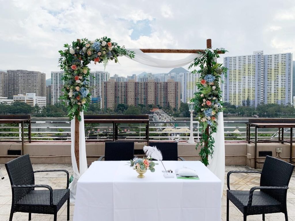 Floating above the city’s hum, this rooftop ceremony feels like a breath of fresh air. Soft chiffon drapes flutter in the breeze, framing a view of skyline symmetry and mountain peaks beyond.