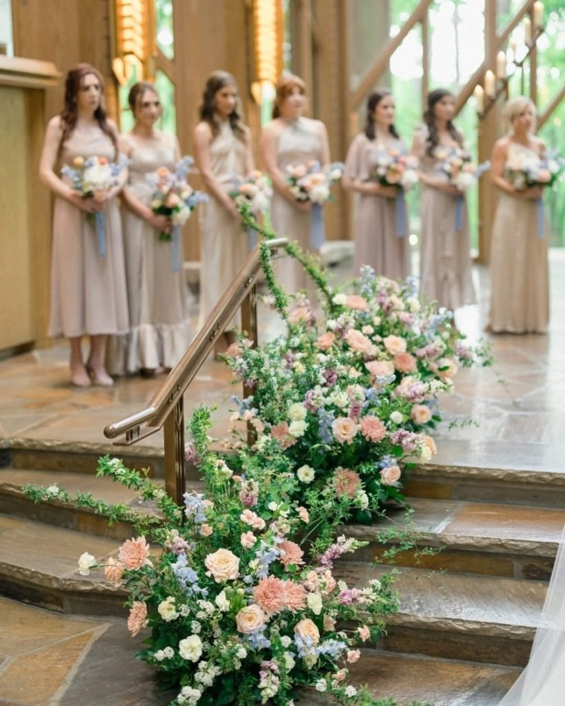 Each step down this aisle feels like a walk through a blooming poem. Garden-style florals in peach, blush, and powder blue spill gracefully along the staircase, echoing the tenderness of the vows to come.