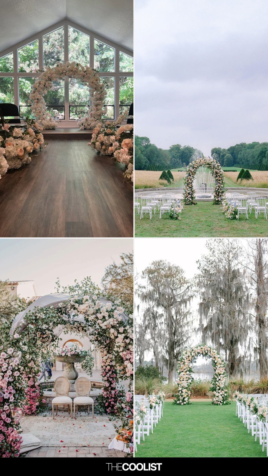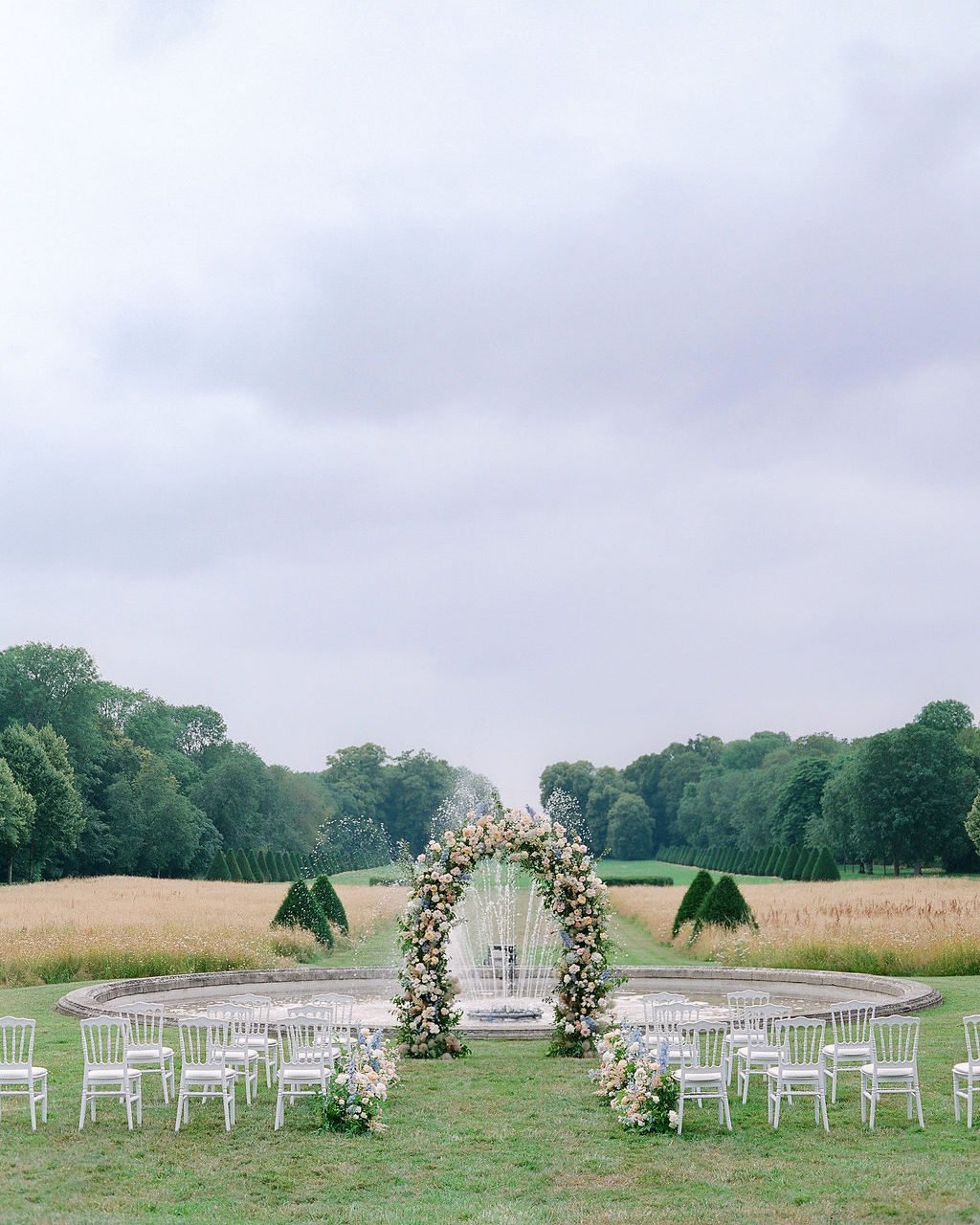 I’ll admit it—I gasped a little when I saw this one from @martha_weddings. The floral arch is already a showstopper, but placing it in front of a fountain in the middle of a sprawling field? That’s pure countryside romance.