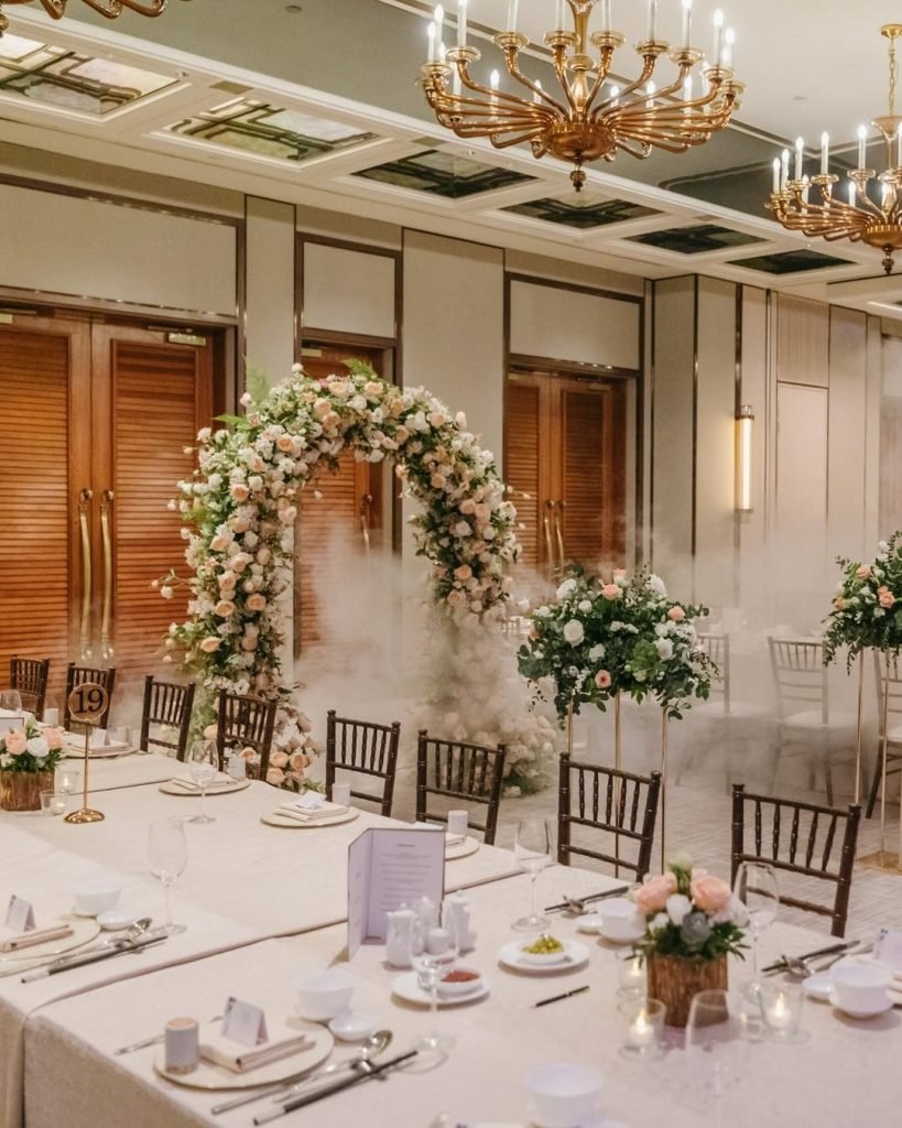 Stepping into this ballroom feels like entering the first page of a love story. A blush-and-ivory floral arch, veiled in delicate mist, becomes both a portal and a promise — the kind of romantic flourish that lingers long after the evening fades.