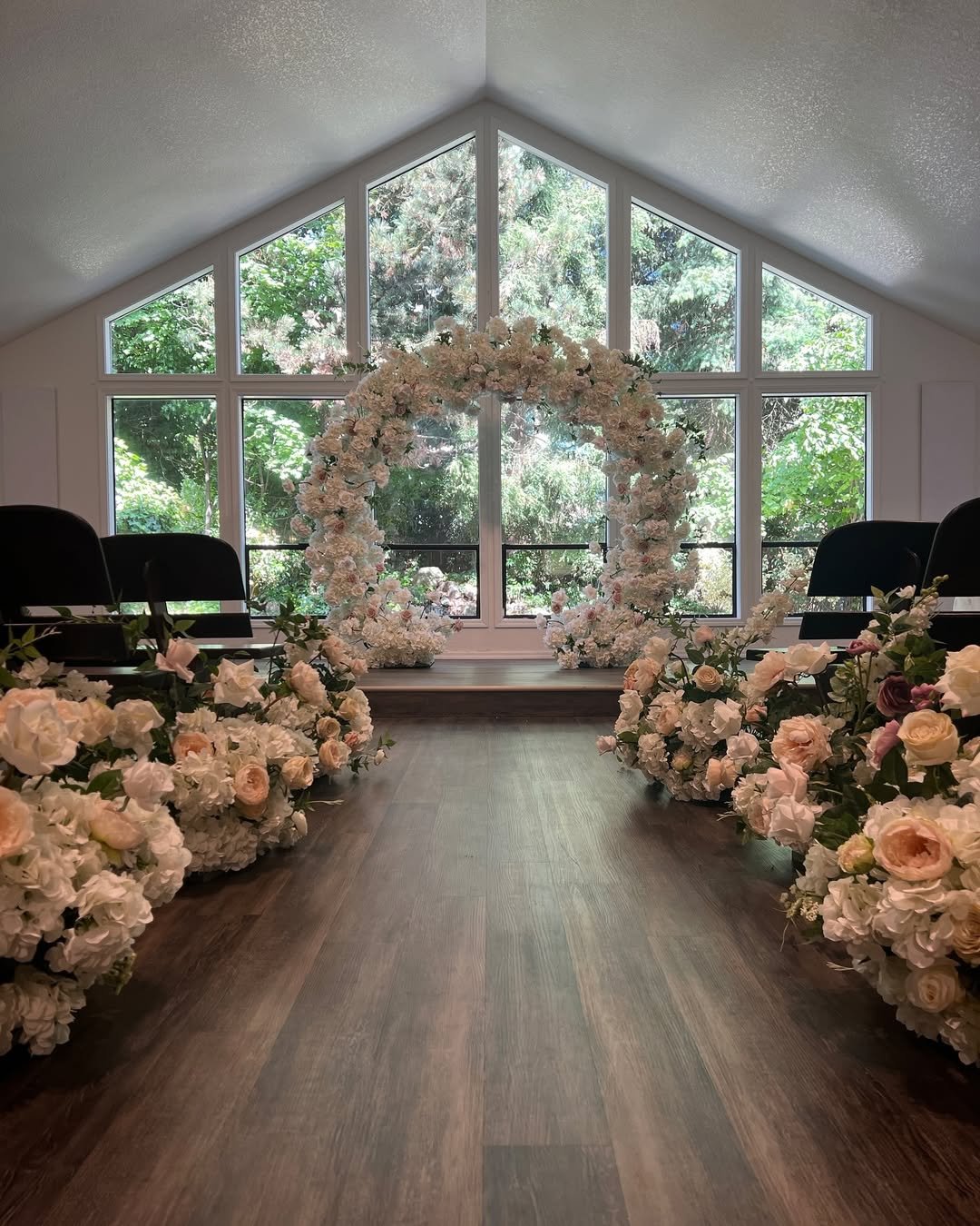 When I saw this dreamy chapel setup by @everlastingarchdesigns, I had to zoom in—twice. That round floral arch framed by the tall windows feels like a portal to an enchanted forest, right in the middle of Portland.