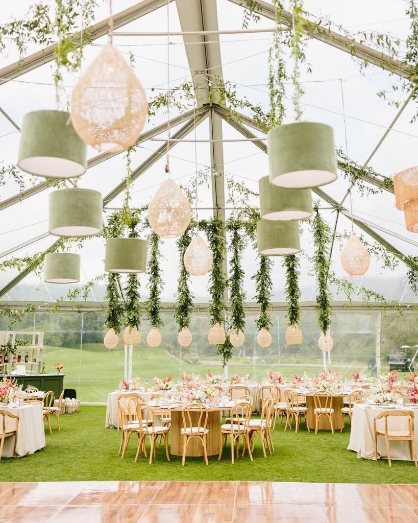 This is what it looks like when the outdoors meets elevated whimsy. A transparent tent, suspended with cascading greens and woven pendants, sets the scene for a wedding that feels both grounded in nature and effortlessly polished.