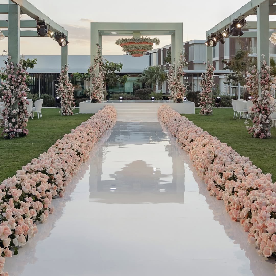 The second I saw this aisle from @bianca_events, I had one thought: this is what it must feel like to walk into your own love story. The mirrored walkway is so crisp it practically glows, and those lush peach blooms lining the entire length? I’m swooning.