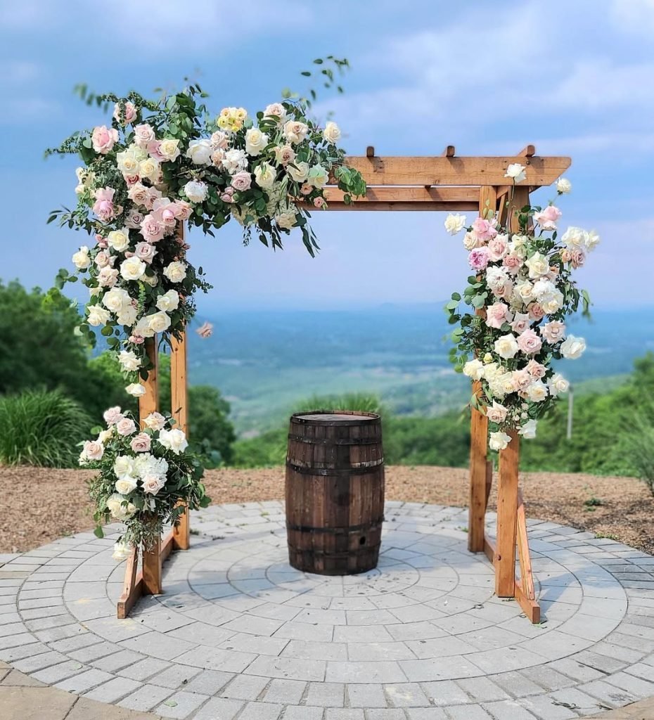 Perched high above a rolling landscape, this wooden arch feels like a frame for forever. Wrapped in lush sprays of blush, ivory, and buttery cream roses, each petal seems to float in the breeze like a vow waiting to be spoken.