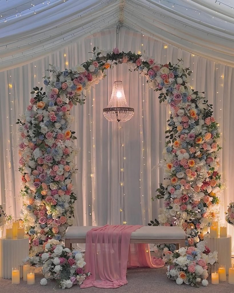 A vision in blush and candlelight — this floral arch whispers of old-world romance and delicate celebration.