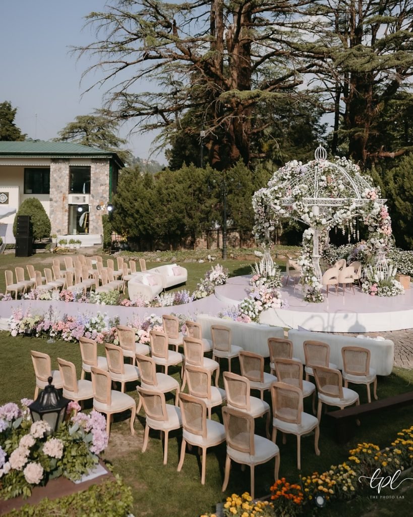 Nestled in the shade of towering evergreens, this garden ceremony feels like a scene lifted from a storybook. A custom circular stage dotted with cane-back chairs creates an intimate arena for vows, wrapped in soft pastel florals and natural textures.