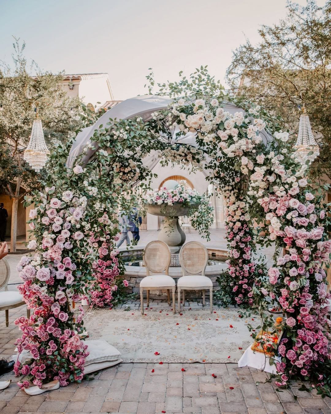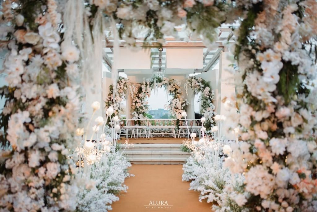 Every detail is delicately orchestrated — from the cascading petals to the soft curvature of the twin arches. It’s a stage for vows that feel timeless, wrapped in nature’s quiet poetry.