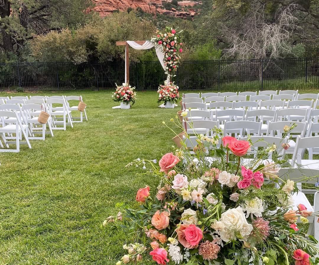 I love how the wild, just-picked vibe of the florals softens the structured rows of white chairs. And with those Sedona red rocks in the background? It’s giving grounded elegance with a side of sunshine.