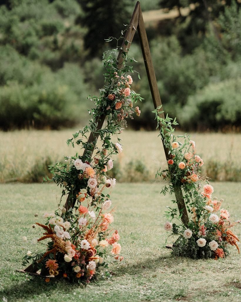 Set against a whispering forest backdrop, this asymmetrical triangle arch feels organic and intentional — like it sprouted right from the meadow. Earth-toned florals in rust, blush, and apricot cascade gently down the frame, interwoven with wild greenery that nods to the surroundings.