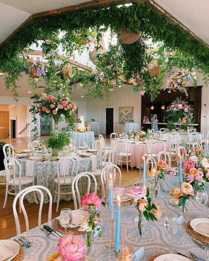 A canopy of cascading greenery and gathered blooms sets the tone for this romantic indoor garden fête — where every table feels like a tucked-away floral vignette.