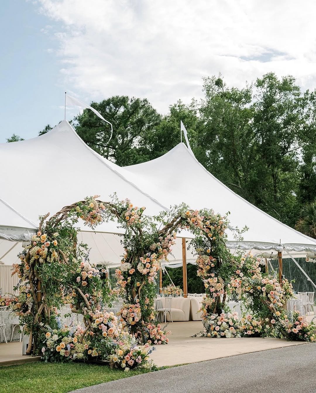 The twisting branches and wild, peachy blooms feel perfectly undone—like nature just happened to arrange herself into giant initials. And tucked beneath that swooping white tent? The whole scene feels like a soft breeze wrapped in linen and summer laughter. It’s giving elegant-meets-enchanted, and I am absolutely here for it.