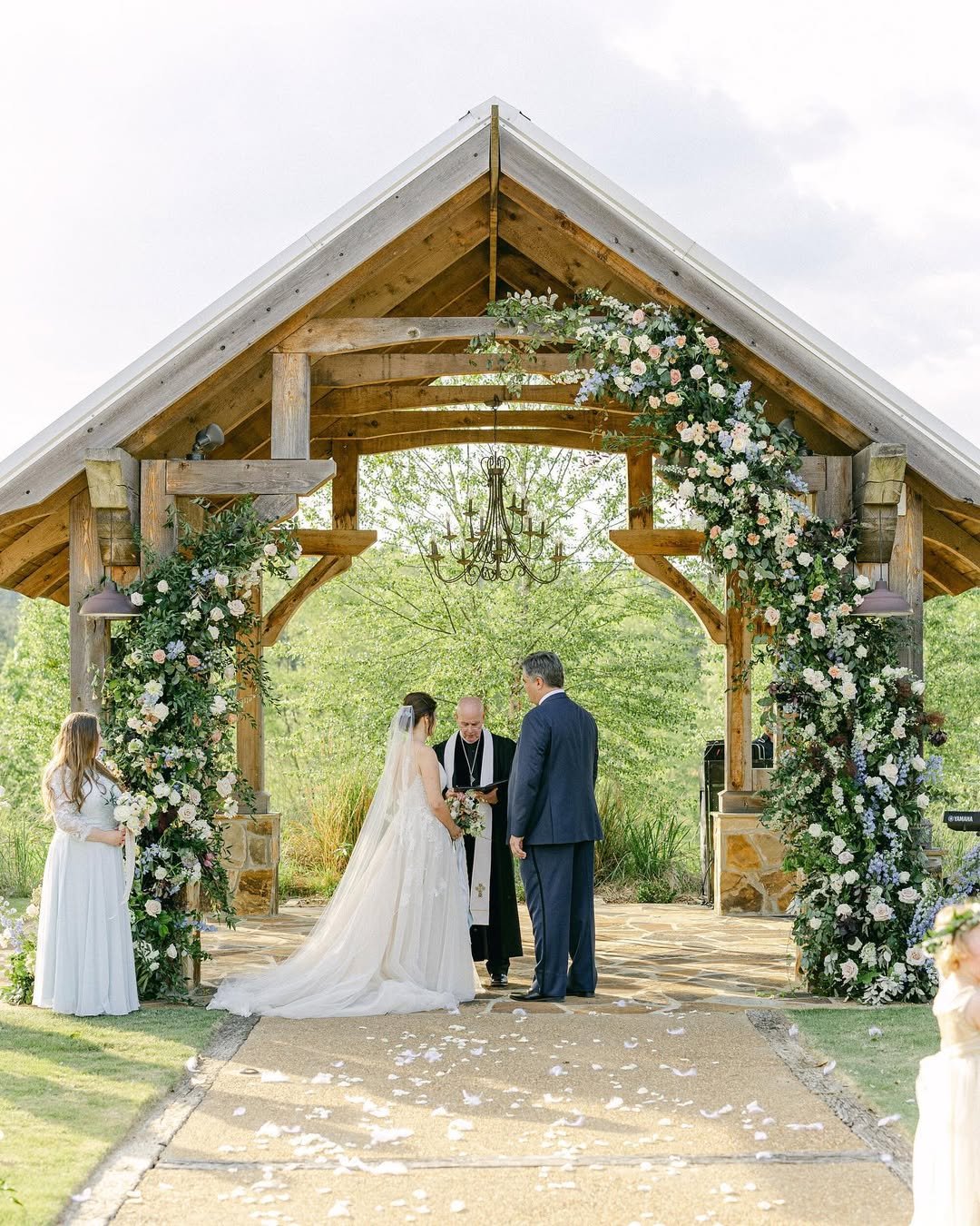 As soon as I saw this ceremony shot from @laurelandsageflorals, I felt like I’d stumbled into the sweetest countryside fairytale. There’s something about that timber-framed altar dripping in blooms that makes your heart soften a little (or maybe that’s just me getting sentimental).