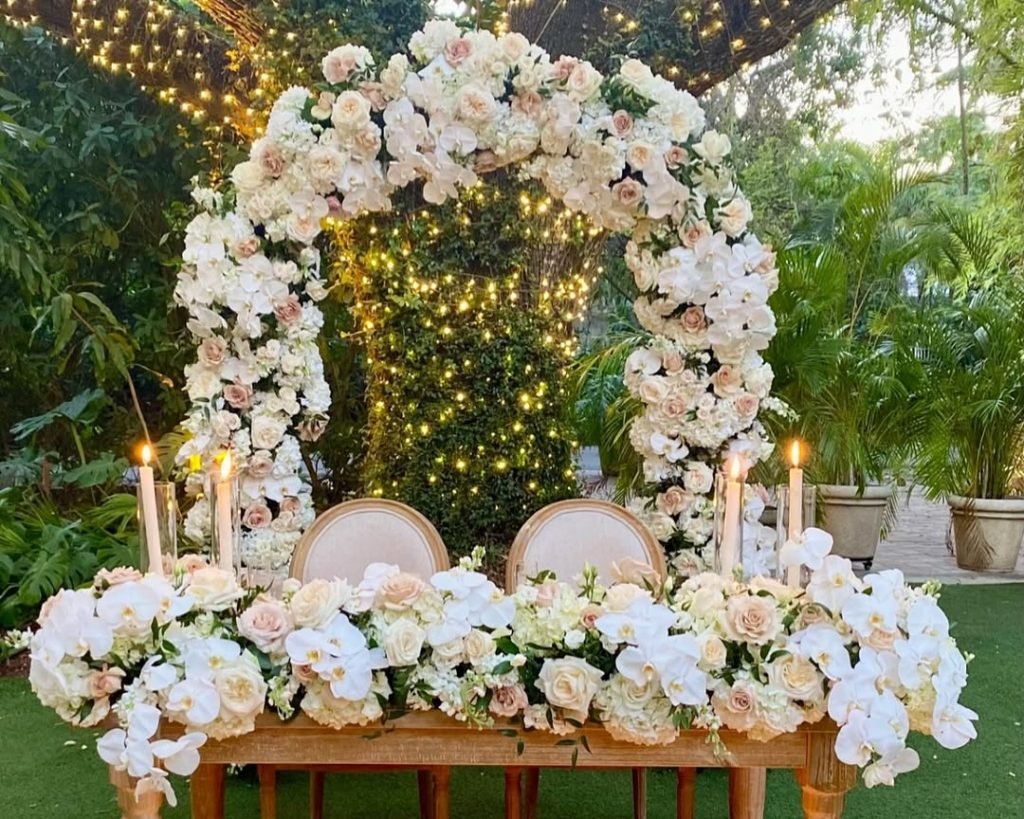 This sweetheart table is pure enchantment. Set beneath a lush archway twinkling with fairy lights, every detail whispers elegance — from the taper candles glowing in soft harmony to the pillowy blooms cascading like poetry across the table.