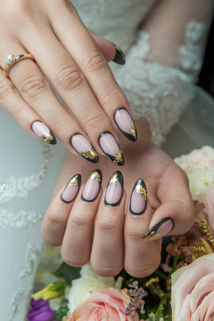 Almond-shaped nails, sheer pink with a high-gloss finish, create the perfect base for the striking black outline, a reimagination of the classic French tip. Delicate flecks of gold leaf shimmer along the edges, catching the light like the first golden rays of a wedding morning. The contrast is magnetic—bold yet soft, modern yet eternally chic.