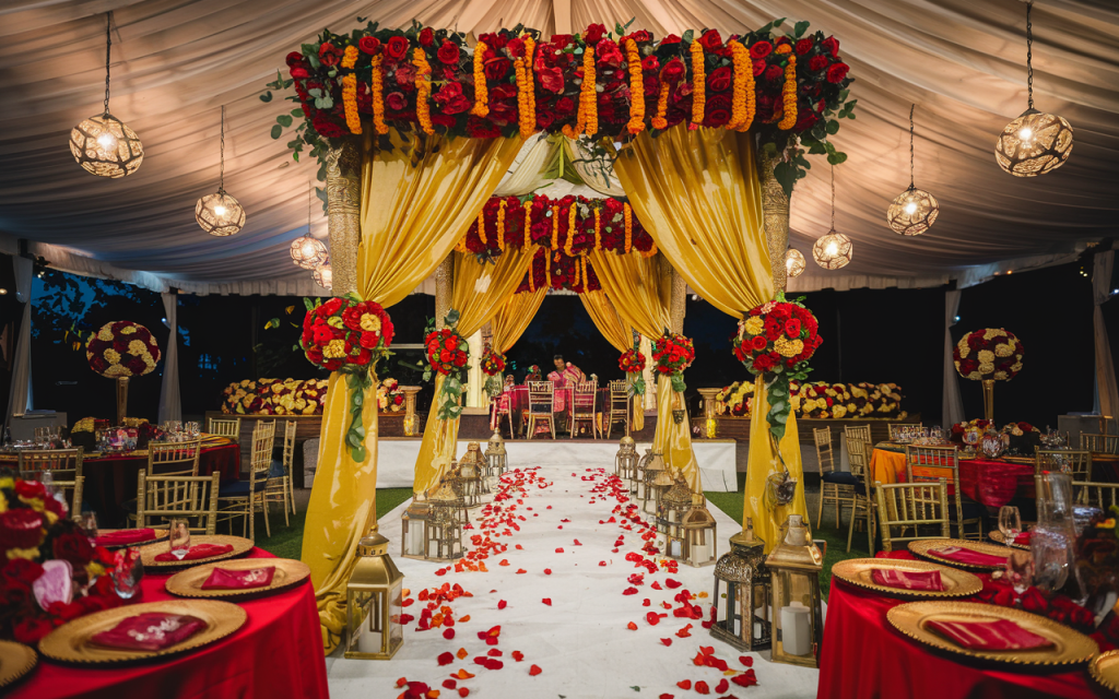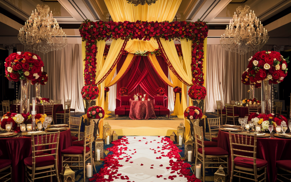 The mandap stands as the centerpiece, with flowing red and yellow drapes framing the ceremony space, while luxurious floral arrangements in rich shades of red, yellow, and white surround the area. The gold accents on the tables add a touch of glamour, and the shimmering floral petals lining the aisle bring a sense of romance and celebration. Crystal candelabras and golden details on the tables offer a regal touch, while the elegant chandelier overhead completes the sophisticated, glowing ambiance.
