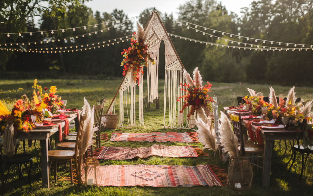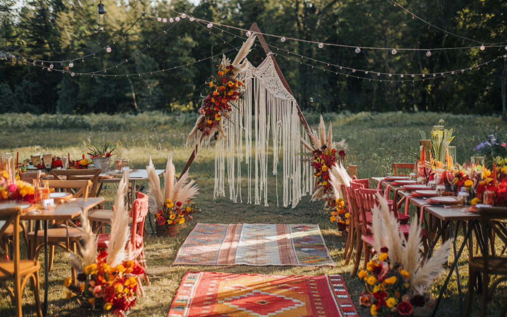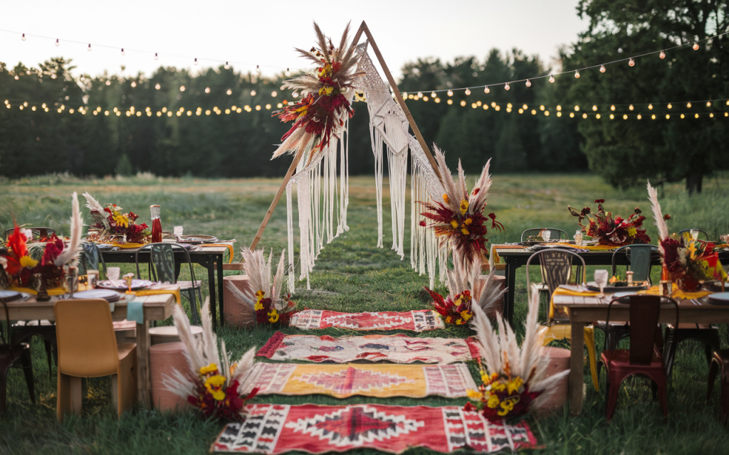 A beautiful macramé arch adorned with cascading pampas grass and fiery red and yellow blooms frames the ceremonial path. Rich, textured rugs in earthy tones guide guests to the center of the celebration, where the rustic wooden tables, surrounded by chairs of various designs, bring a relaxed charm. Overhead, twinkling string lights cast a soft glow, enhancing the serene yet festive ambiance of the meadow.