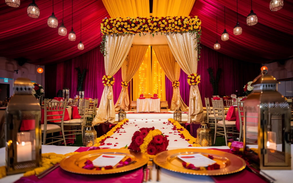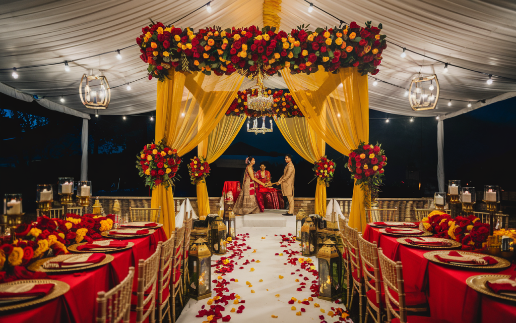 The mandap, with its striking red and yellow drapes, is adorned with beautiful floral arrangements in rich tones of red, yellow, and white, bringing warmth and romance to the scene. Flanking the ceremony area, towering floral centerpieces on gold candelabras add a regal touch, while soft lighting creates a warm and inviting atmosphere. The tables, with their luxurious red tablecloths and gold chargers, are perfectly coordinated to reflect the wedding’s color scheme, ensuring a cohesive and upscale look throughout the venue.