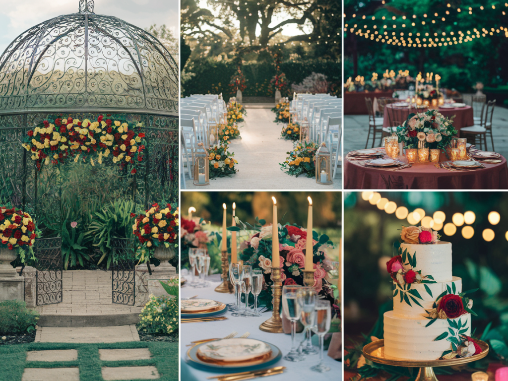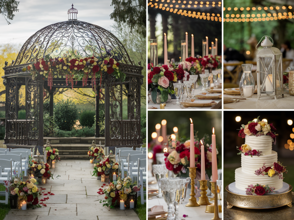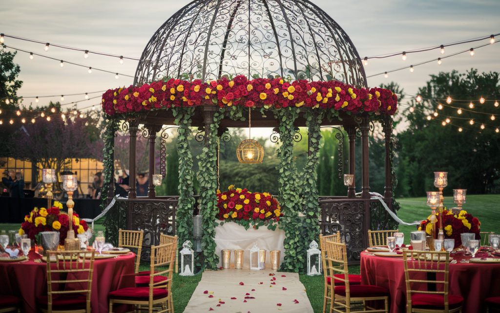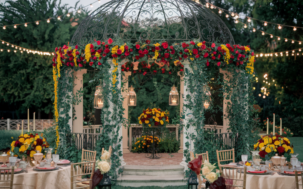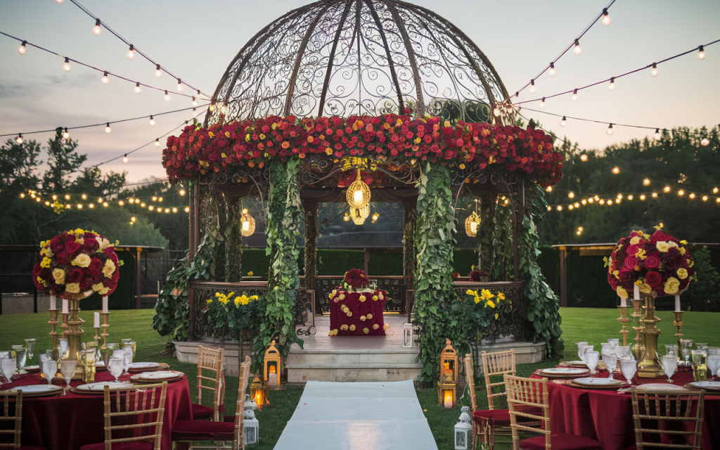 This breathtaking garden wedding setup features a charming wrought-iron gazebo draped in cascading greenery and vibrant red and yellow roses, perfectly complemented by the warm glow of string lights. The soft evening light enhances the beauty of this romantic, open-air ceremony, making it the ideal setting for a celebration of love.