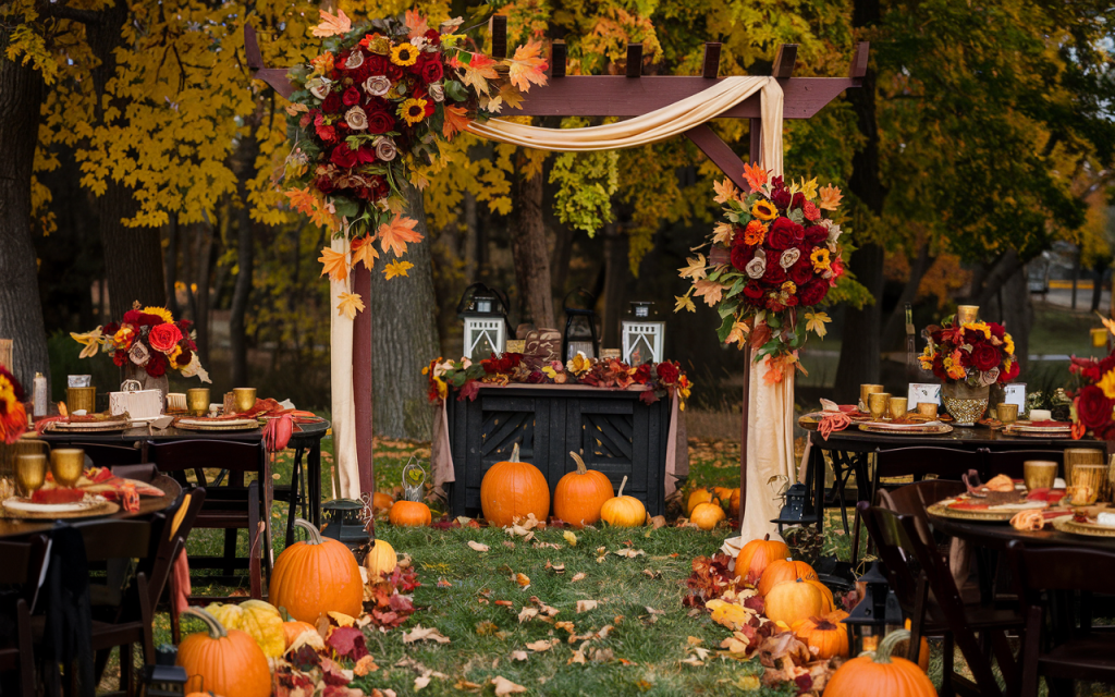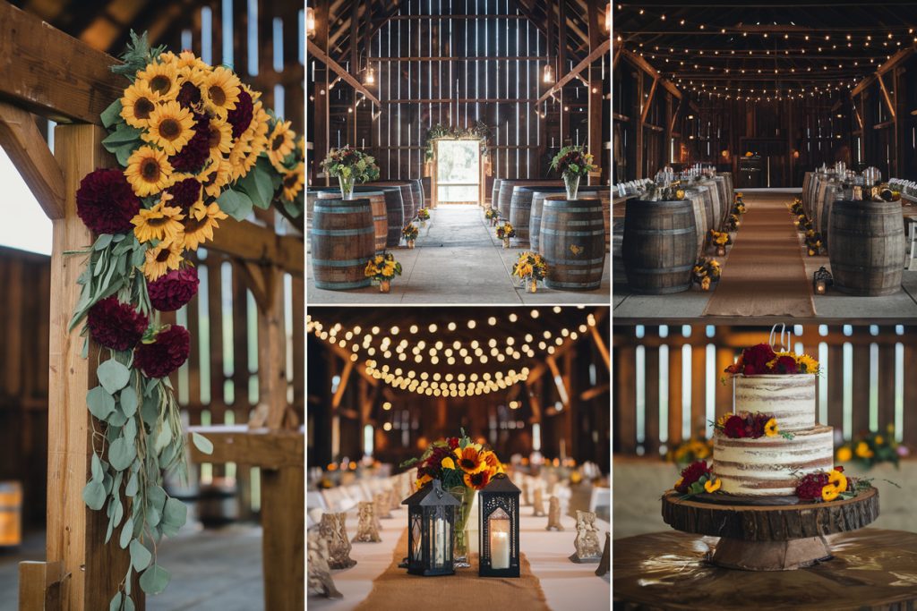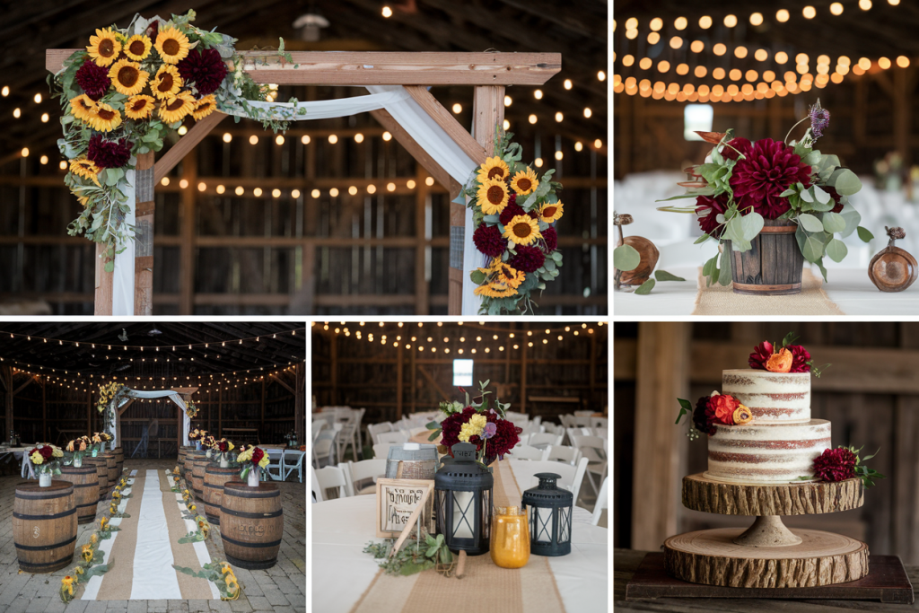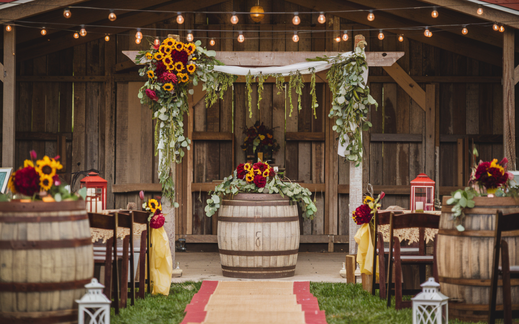 This charming rustic wedding setup captures the essence of a cozy, countryside celebration. The barn-style backdrop, combined with vibrant sunflowers and rich red blooms, creates a warm, inviting atmosphere. Soft lighting and natural wooden accents add to the rustic charm, making this a perfect outdoor ceremony.