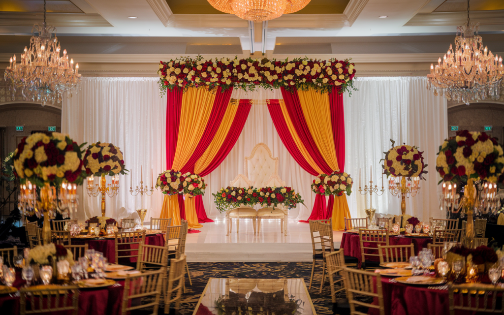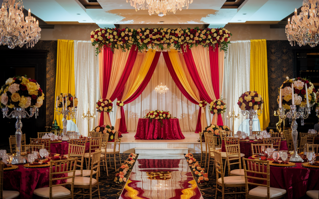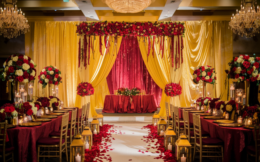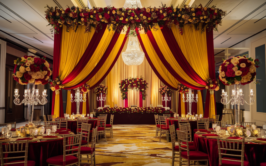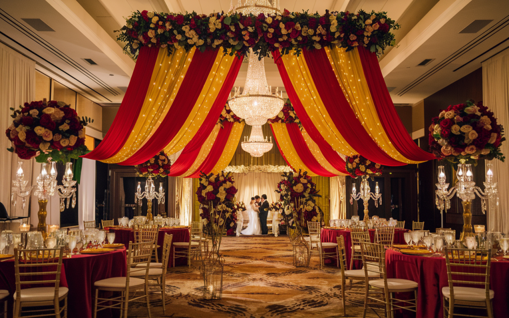 This spectacular ballroom wedding setup combines vibrant colors with stunning elegance. The rich combination of red, yellow, and gold creates a vibrant yet sophisticated atmosphere, perfect for an unforgettable celebration.