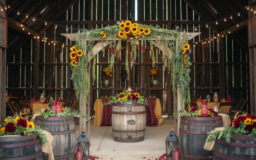 The ceremony space is framed by a charming wooden arch adorned with cascading greenery and vibrant sunflowers. The aisle, lined with barrels and floral arrangements, creates a natural and rustic path to the altar. Soft string lights overhead illuminate the barn’s wooden beams, adding a cozy, intimate glow. The surrounding tables, adorned with yellow and maroon tablecloths, are complemented by more sunflowers and rustic lanterns, completing the scene with a perfect country-chic charm.