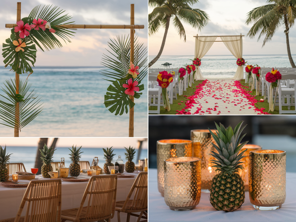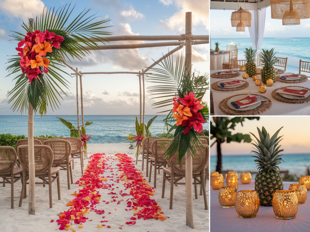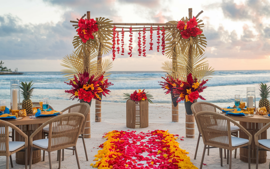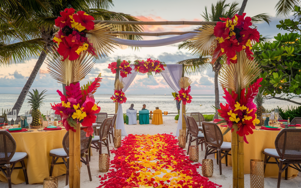 The ceremony area features a bamboo arch adorned with bright red and yellow flowers, leading the couple towards the altar with a path of scattered petals. The tropical floral arrangements in large vases add a vibrant touch, while the tables are set with a fun combination of pineapples, tropical flowers, and bold-colored napkins and glasses, reflecting the tropical theme. The golden hour glow over the ocean makes this the perfect setting for a romantic and lively celebration.
