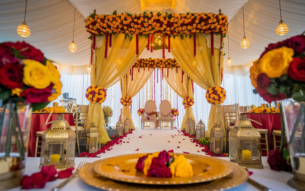 The Mandap, adorned with gold drapes and vibrant floral arrangements of red, yellow, and maroon marigolds, serves as a stunning focal point for the ceremony. The gold fabric drapes create a regal backdrop, while the flowers bring life and color to the space, making it perfect for a celebratory wedding atmosphere.