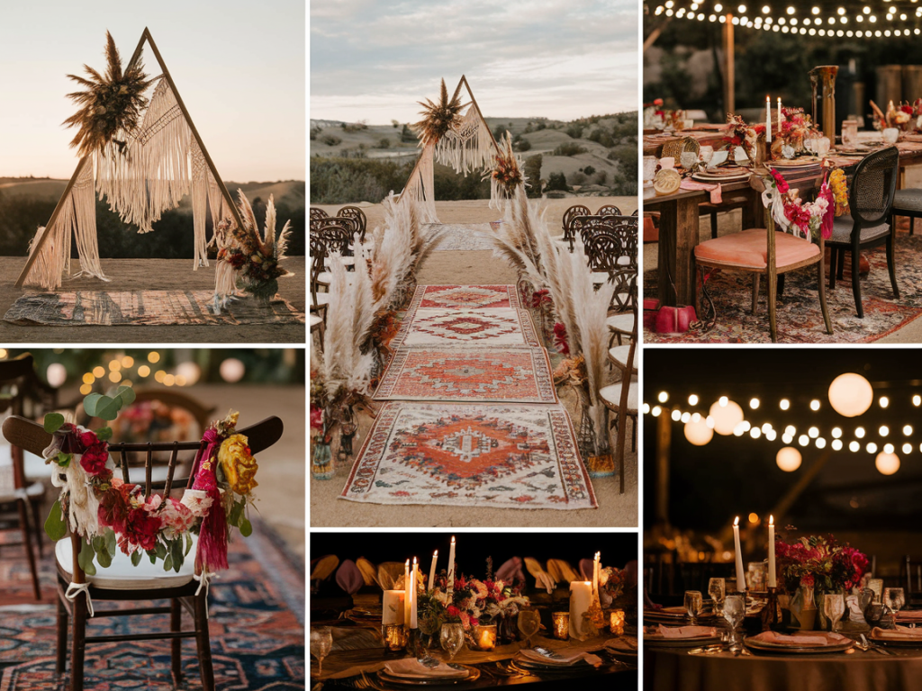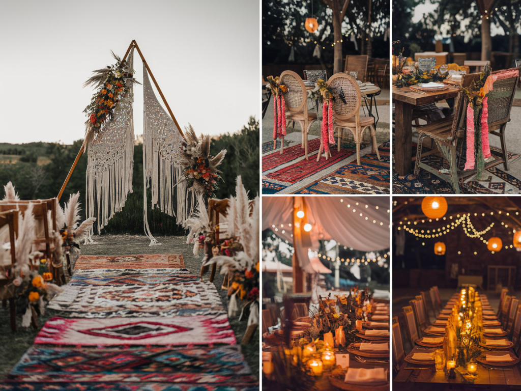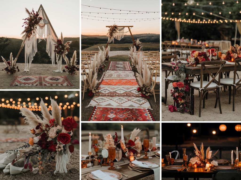 The design features a stunning boho-style arch draped with delicate macramé and adorned with wildflowers and pampas grass. The lush carpet of red, yellow, and white tribal-patterned rugs leads guests to the heart of the event. Tables are accented with charming vintage chairs in bold colors, complementing the wild, untamed floral arrangements. String lights overhead add a magical glow, perfect for an evening under the stars.