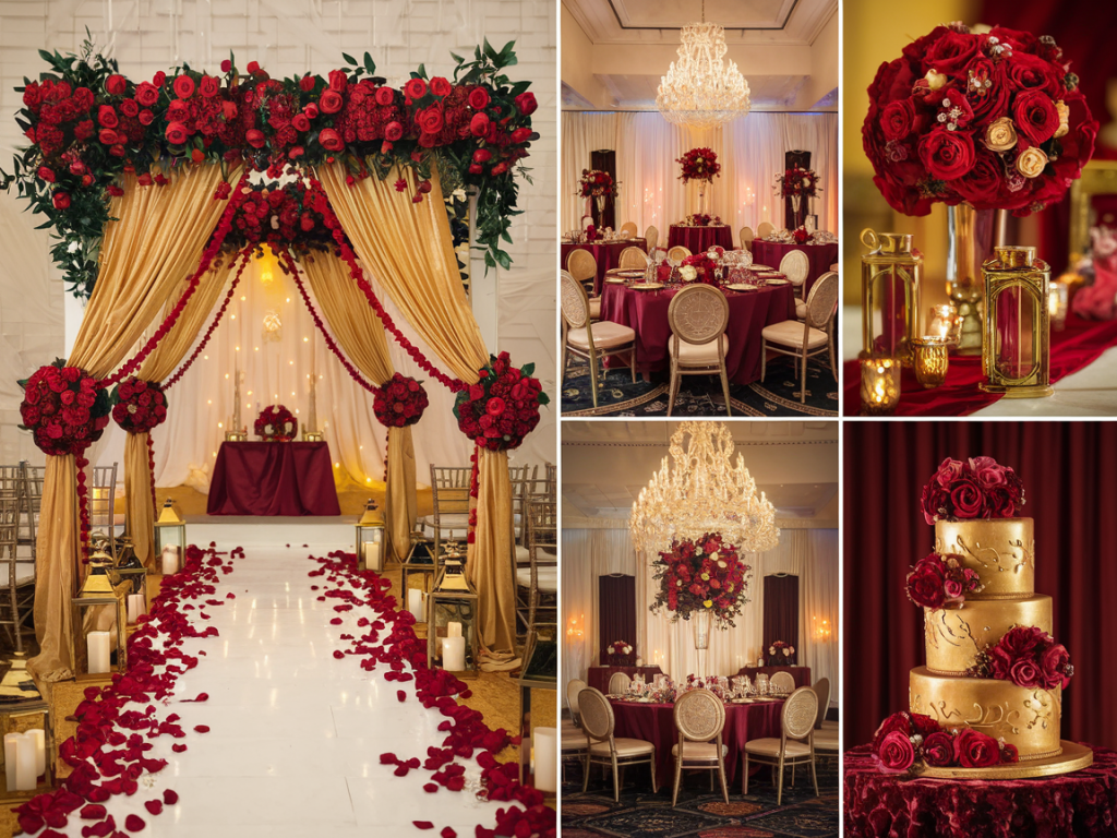 The round tables at the reception are set with luxurious gold chargers, burgundy napkins, and intricate glassware. A statement floral arrangement of red, white, and yellow blooms in silver vases adds a touch of elegance to the centerpieces. The gold-rimmed plates and cutlery enhance the overall lavish feel of the event.