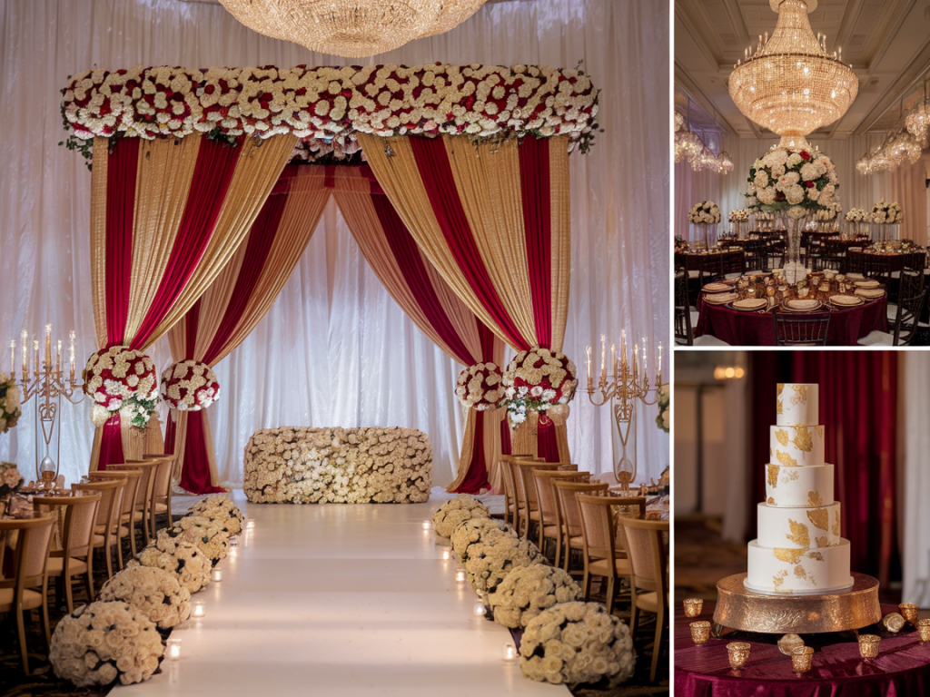 The Mandap is a stunning combination of burgundy and gold drapes, framed by lush floral arrangements in shades of red, pink, and white. The elegant chairs, placed in the center, add to the luxurious feel of the sacred space. This structure serves as the focal point for the ceremony, with its rich, romantic aesthetic.