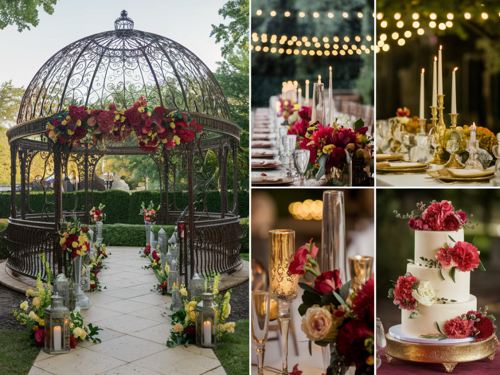 The gazebo stands as the focal point of the ceremony, framed by lush greenery and colorful floral arrangements, creating a picturesque backdrop for vows. Lanterns line the aisle, adding a soft glow and guiding guests to the altar. Elegant round tables, adorned with rich red linens and golden accents, complete the scene, offering a cozy and intimate atmosphere. The combination of the lush garden, stunning florals, and twinkling lights creates an unforgettable setting for a truly special day.