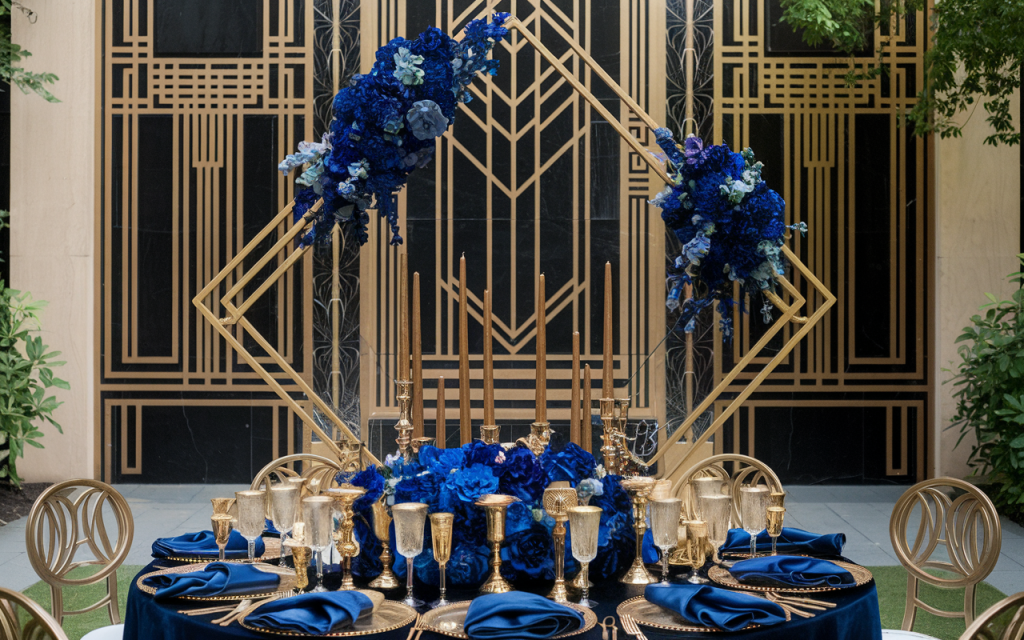 A striking black and gold backdrop, adorned with intricate Art Deco patterns, sets the stage for an unforgettable evening. The table setting is nothing short of indulgent—golden goblets, velvet navy napkins, and candlelit grandeur create an air of timeless luxury. Electric blue floral arrangements cascade from the frame, offering a bold contrast against the rich metallic hues.