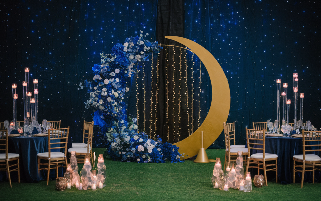 A wedding where the cosmos aligns with romance, this celestial-inspired setting brings the ethereal beauty of the night sky to life. Deep navy-blue drapery, speckled with twinkling star-like lights, forms an infinite galaxy, while a golden crescent moon—a symbol of timeless love—stands at the heart of the altar, adorned with cascading royal blue and ivory florals.