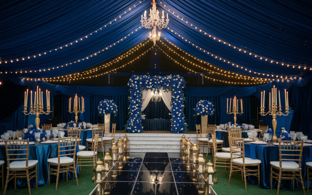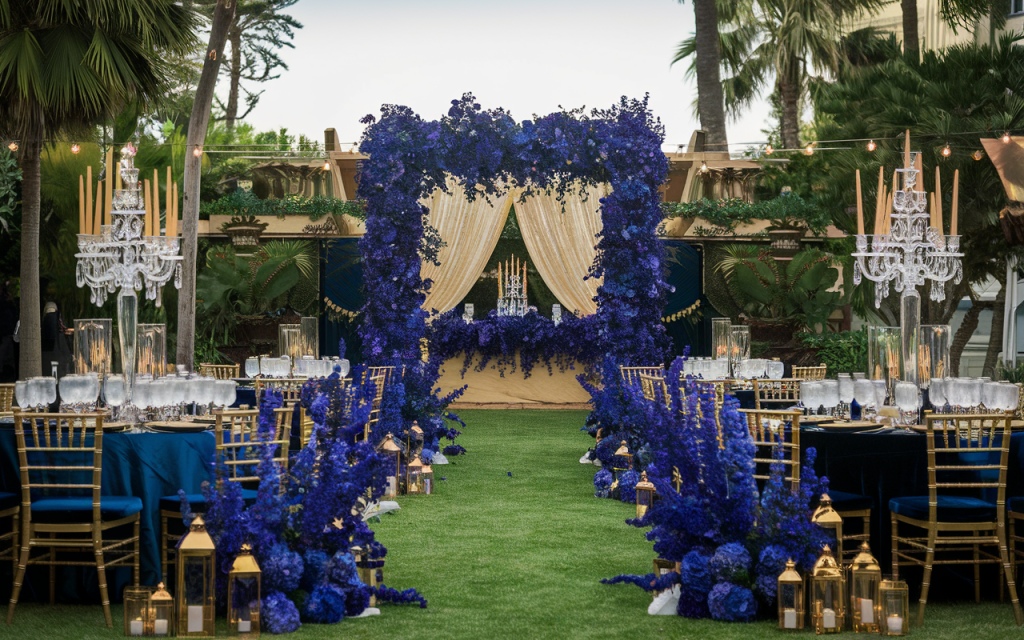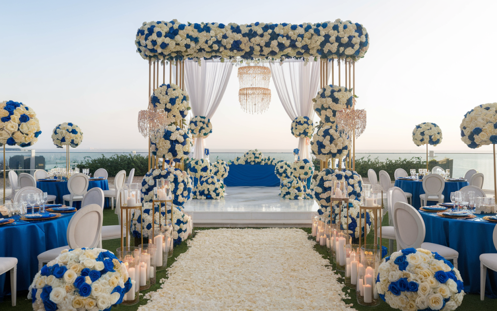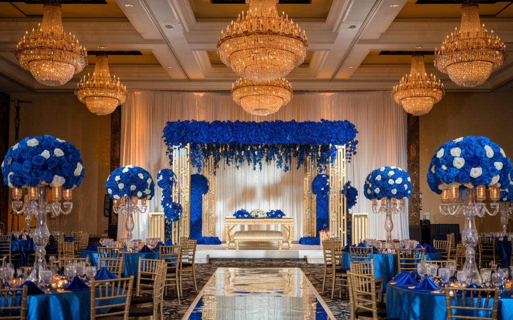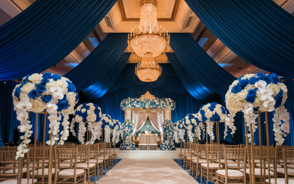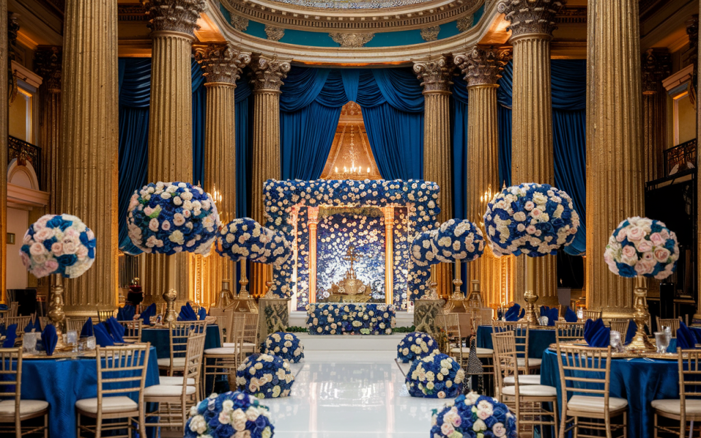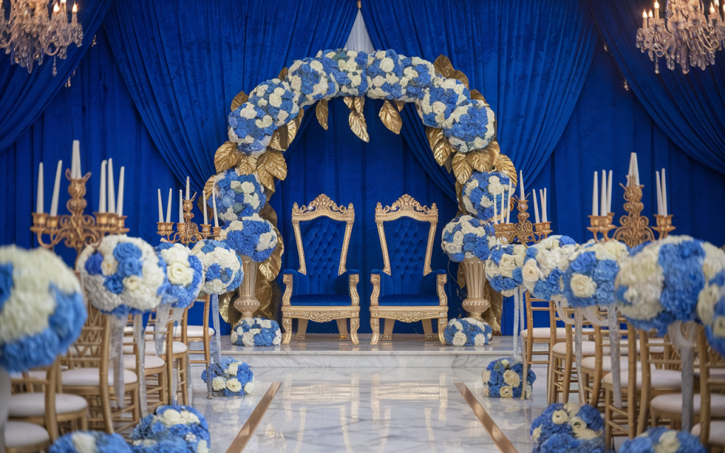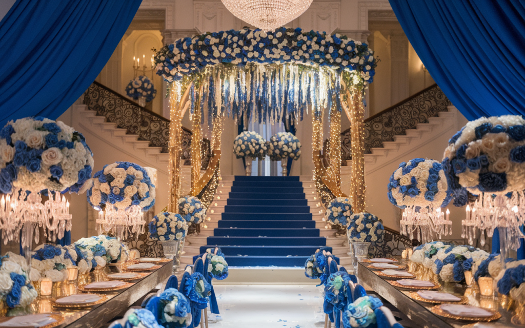 A wedding where luxury meets enchantment, this royal blue masterpiece is a celebration of passion, prestige, and timeless romance—a setting fit for a modern-day fairytale.