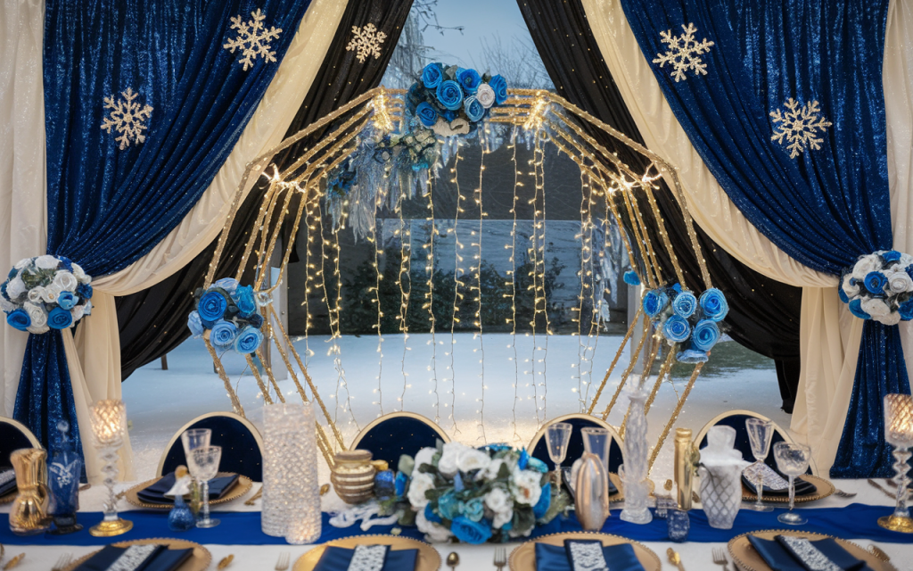 A breathtaking winter wonderland unfolds in this mesmerizing wedding setup, where icy blues and shimmering golds blend seamlessly against a pristine snowy backdrop. The atmosphere is ethereal—snowflake embellishments sparkle against rich navy velvet drapery, while a geometric gold arch adorned with cascading fairy lights evokes the magic of a starlit winter’s night.