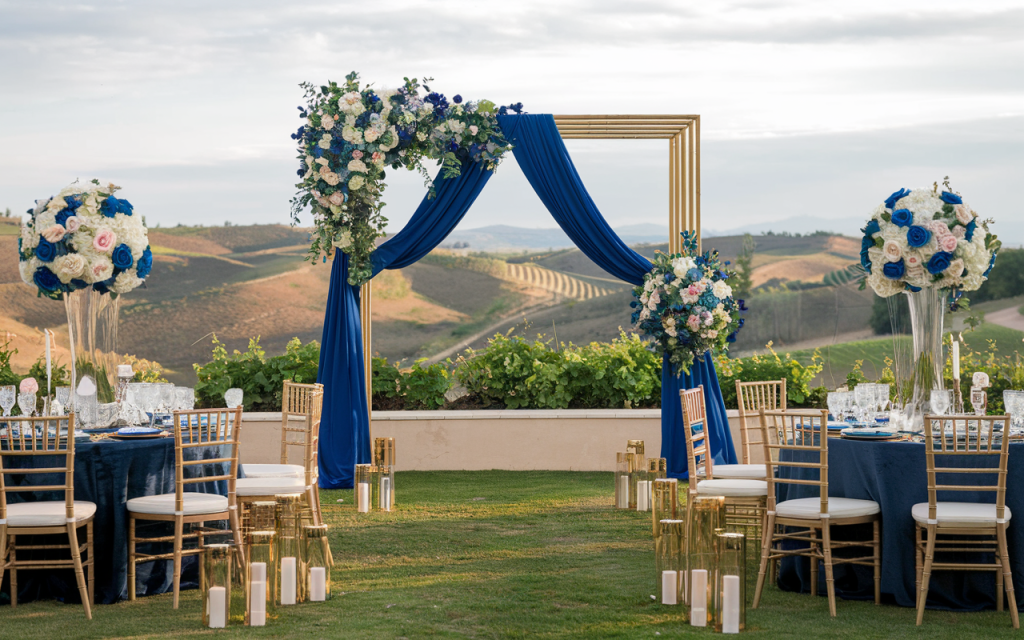 A modern golden arch, draped in deep sapphire fabric, frames the landscape like a living painting, while lush floral arrangements cascade in soft whites, blush tones, and vibrant blues. Tall glass vases filled with delicate blooms add height and grandeur, mirroring the sky’s infinite stretch.