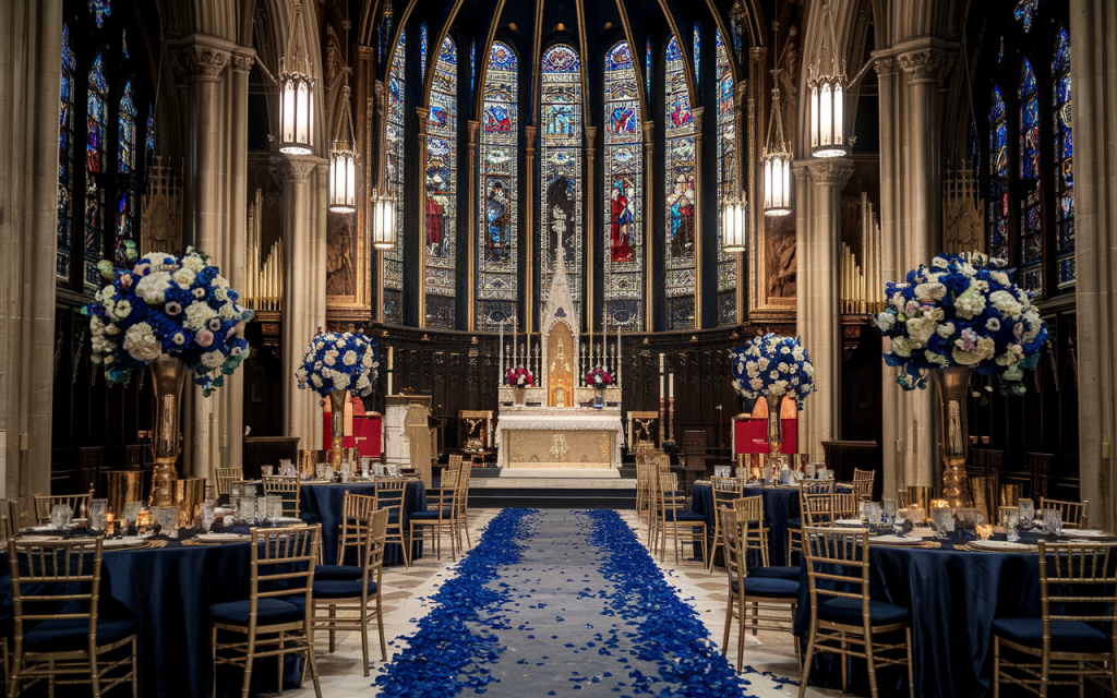 Beneath the celestial glow of stained glass windows, this cathedral wedding unfolds in a symphony of deep blues and golden accents. The vaulted ceilings, the monumental columns, and the illuminated altar create a setting that feels nothing short of divine.