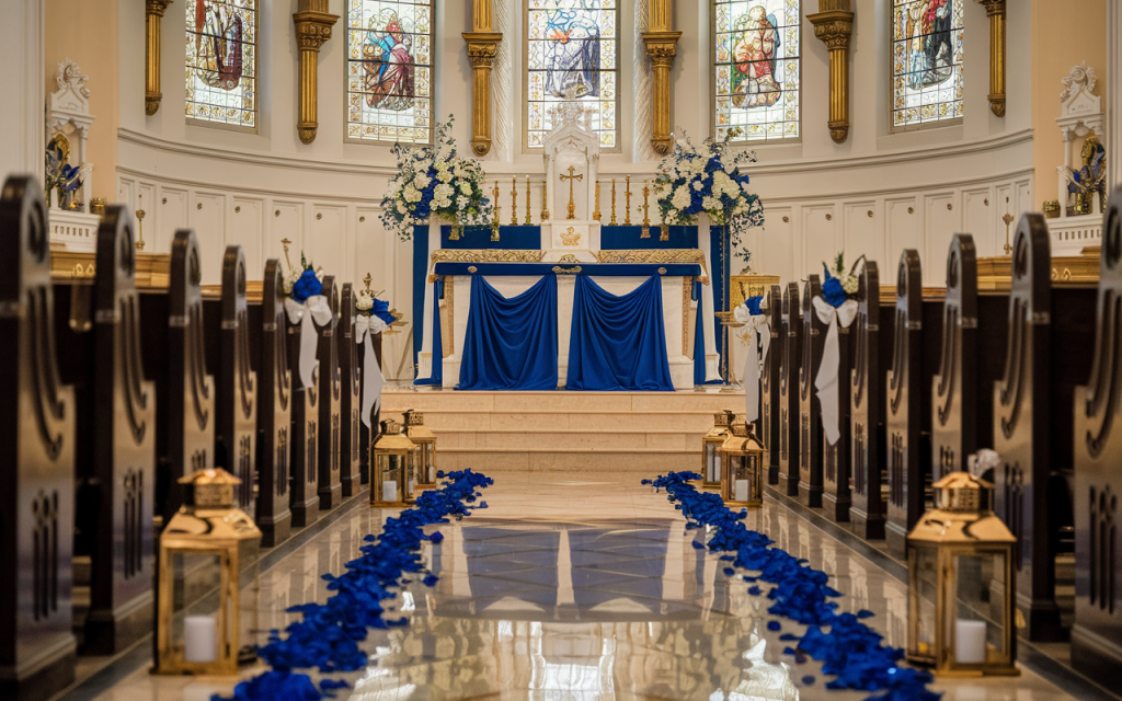 The altar itself is a masterpiece—draped in cascading blue fabric, framed by gilded candlesticks, and crowned with intricate floral arrangements of ivory and sapphire. Stained glass windows cast a warm glow, their intricate designs telling stories of faith and devotion, enhancing the solemnity of the moment.