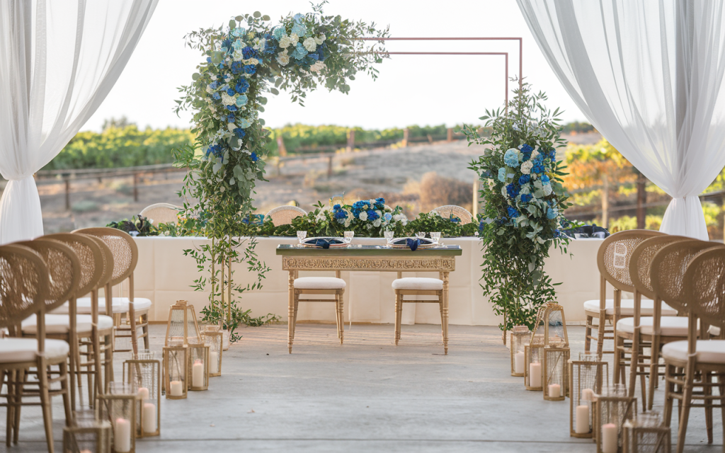 At the heart of this serene setting, a delicate arch entwined with lush greenery and cascading blue and ivory blooms creates an ethereal focal point. The ornate sweetheart table, adorned with fresh florals and deep sapphire accents, is an invitation to celebrate love in its purest form.