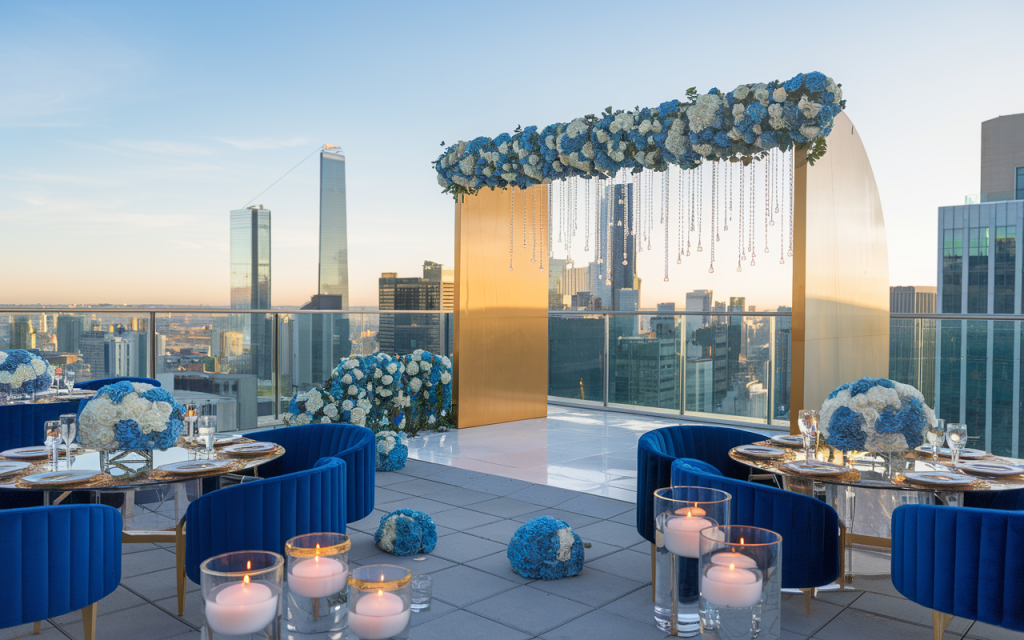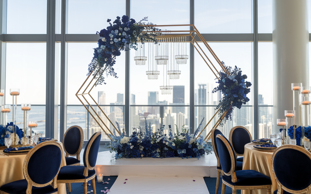 A geometric gold arch adorned with cascading sapphire blooms frames the skyline like a work of art, while delicate crystal chandeliers dangle like frozen raindrops in midair. The deep navy and gold palette exudes opulence, with candlelit tables draped in soft metallic linens, creating an ambiance that feels both regal and intimate.