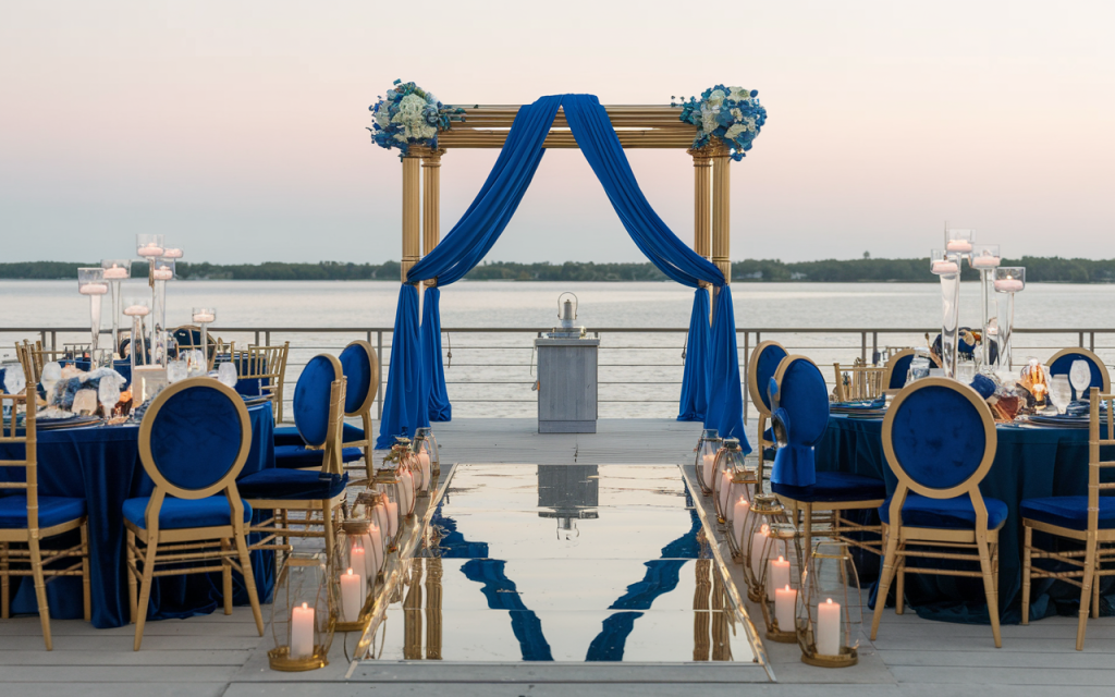The Sunset Serenade wedding is a poetic dance of luxury and serenity, set against the tranquil embrace of still waters. As the sky melts into hues of soft pastels, the scene is draped in a regal palette of deep sapphire and gilded accents, creating an ambiance of refined sophistication.